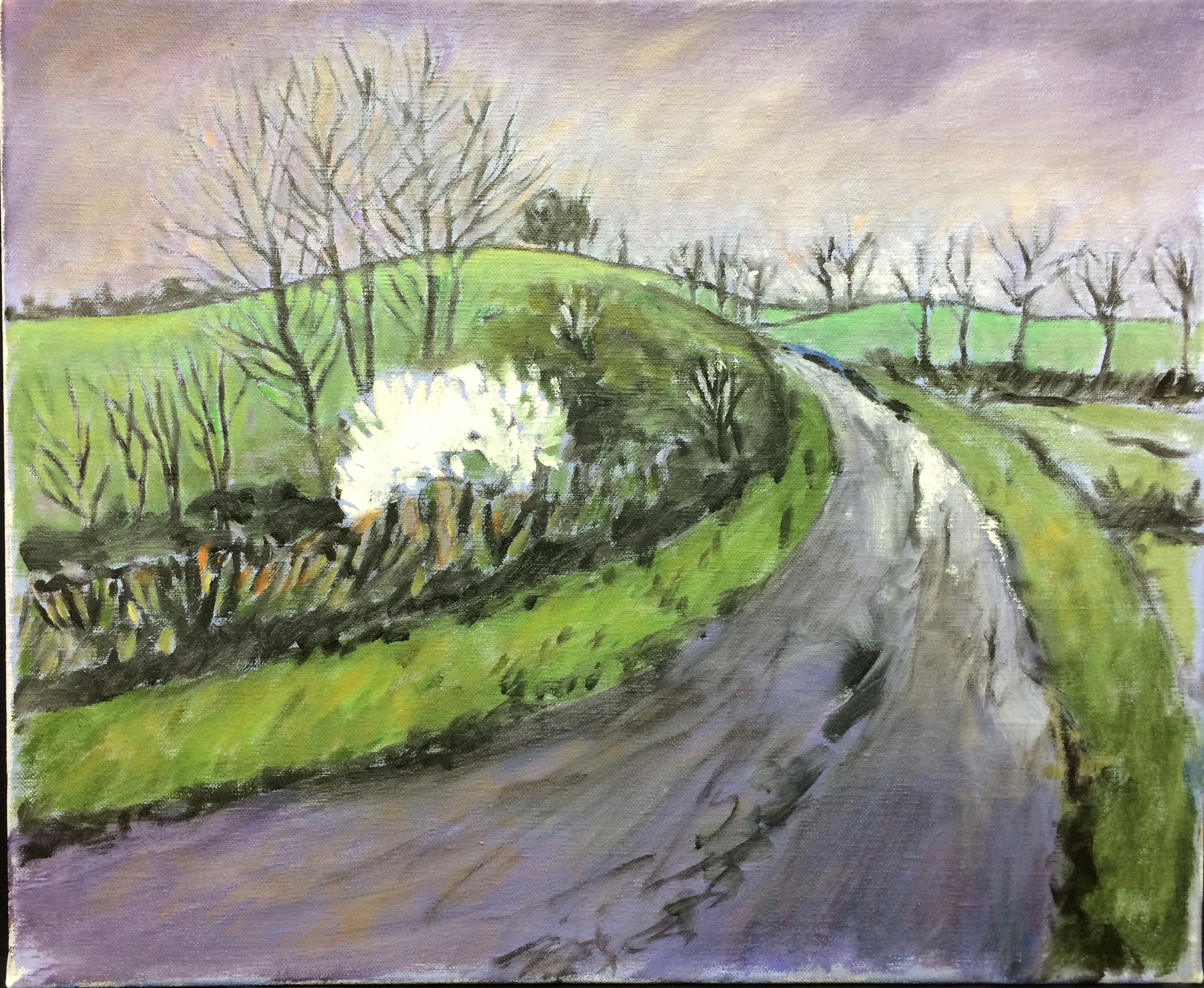Un ciel couvert de temps de pluie, la route mouillée qui reprend la couleur de ce ciel, le vert des prés et surtout le bouquet des fleurs blanches qui éclairent ce petit paysage.