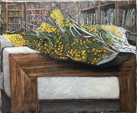 J'avais acheté le mimosa pour faire une nature morte. Je l'avais posé en attendant sur un accoudoir de fauteuil. L'idée de la toile est venue toute seule.