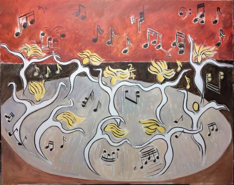 Formes stylisées qui forment une ronde et dansent sur les notes de musique virevoltantes.