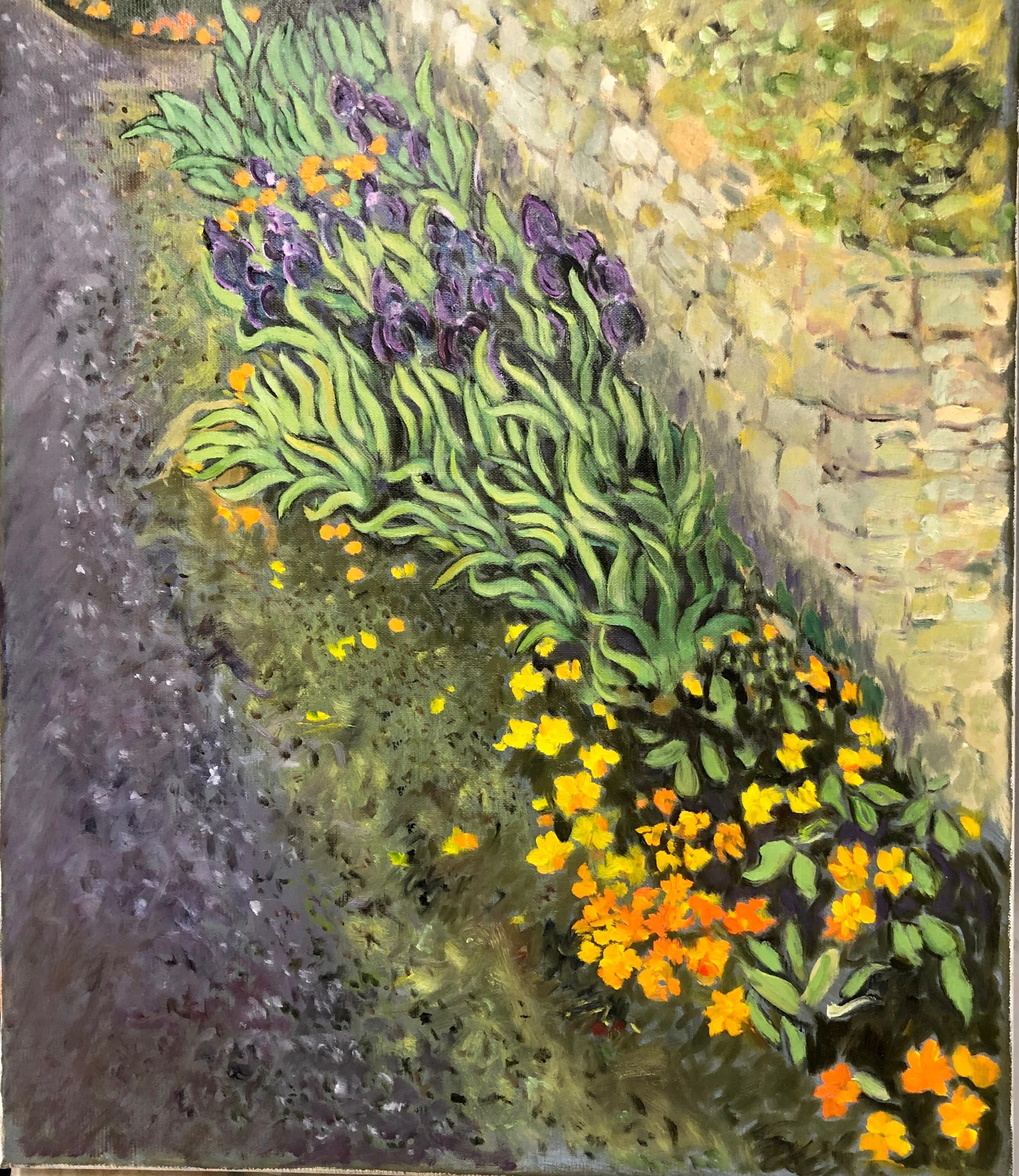 Cette plantation d'iris et de fleurs jaunes en bas d'un mur, côté route, m'a tout de suite donné l'idée d'une toile.