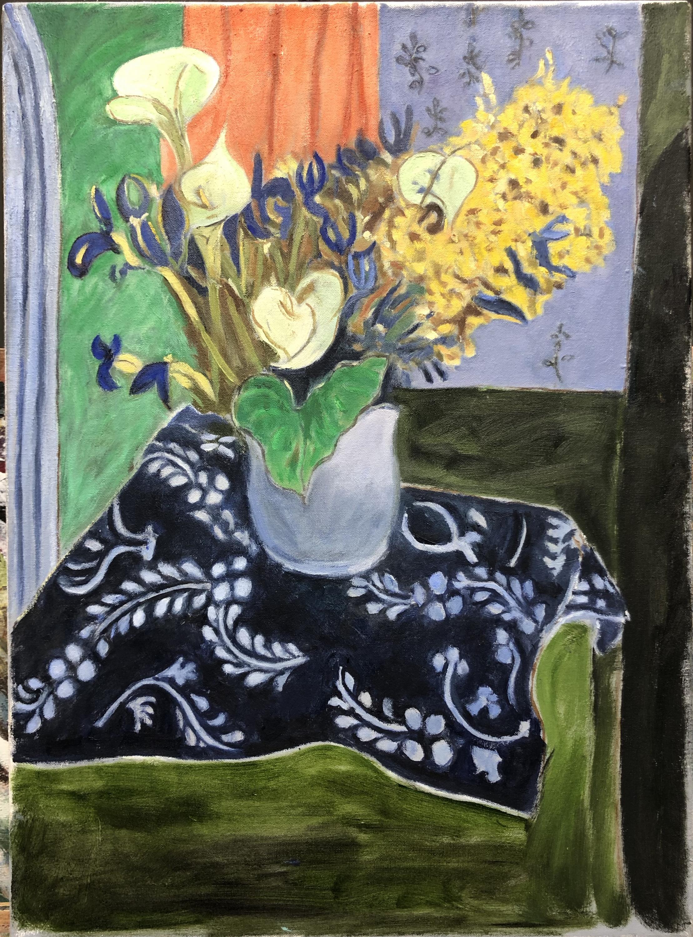 MC avait hérité de deux cadres, dont un qui venait d'une arrière grand-mère. J'ai fabriqué deux toiles aux dimensions ad hoc et j'ai cherché deux sujets pour finalement m'en remettre à Matisse, une valeur sûre... ! Là j'ai découvert un petit problème, évident, mais auquel pourtant je n'avais pas songé. Le ratio des longueur, largeur des originaux ne coïncidait pas avec celui des cadres de la grand-mère...