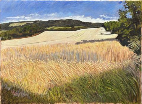 j'avais déjà fait une toile du même sujet avec les blé coupés. Dans ce chemin qui part du lavoir des 9 Fontaines : un sujet de toile tous les dix mètres...